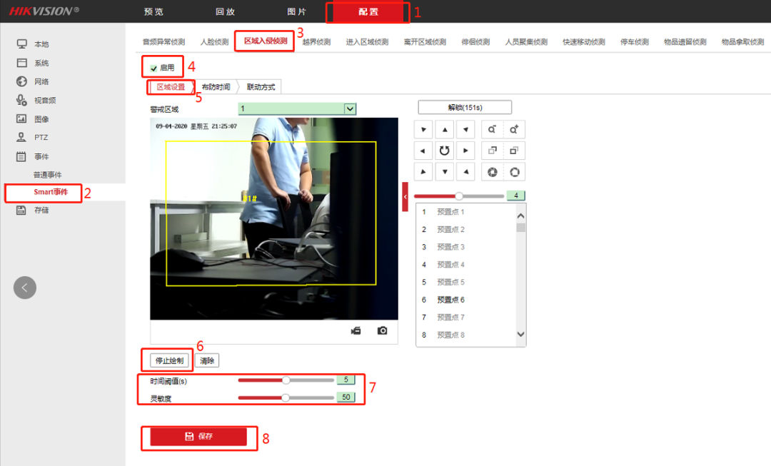 3、按照監控具體場景需求繪製規則區域、靈敏度。